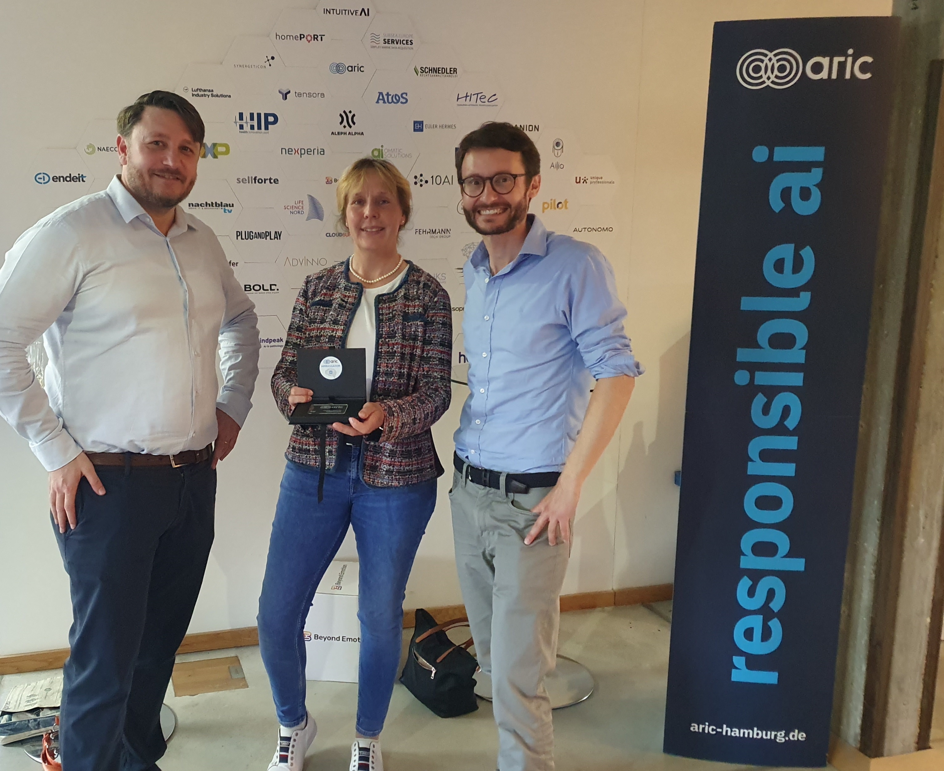 Wir freuen daher mit unserer Kollegin Christine Benecke - sie wurde vom Artificial Intelligence Center Hamburg e.V. (ARIC) zum Ambassador ernannt. Alois Krtil (li) als besonderer Vertreter und Jan Schnedler (re), Chief Legal Officer des ARIC übergaben die personalisierte Karte.
