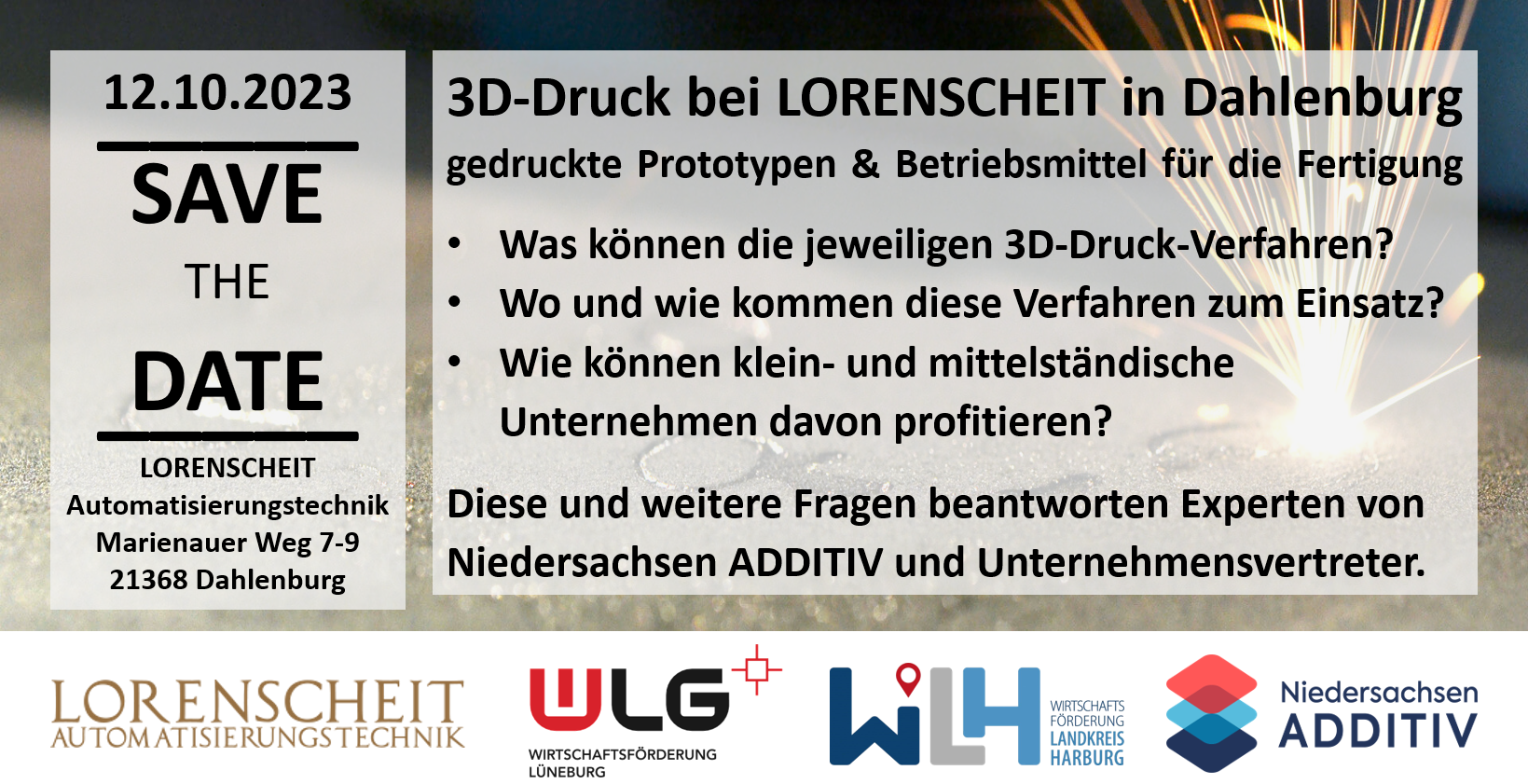Diese Veranstaltung widmet sich dem Einsatz von faserverstärkten Kunststoffen im 3D-Druck sowie der Herstellung von Prototypen und Betriebsmitteln durch den industriellen Metall-3D-Druck. Es gibt spannende Live-Interviews mit renommierten Wissenschaftlern und Praktikern und Live-Demonstrationen, um die Technologie hautnah zu erleben. Organisiert wird die Veranstaltung gemeinschaftlich von Niedersachsen Additiv aus Hannover, den Wirtschaftsförderungsgesellschaften für die Stadt und den Landkreis Lüneburg und Landkreis Harburg und dem Unternehmen Lorenscheit Automatisierungs-Technik GmbH aus Dahlenburg.
